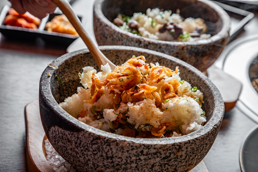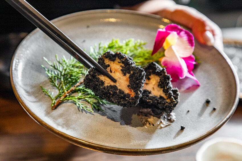 餐點中還有松露蝦球,外表雖然黑嚕嚕的像小櫻桃,裡面卻藏著台菜的靈魂,一口咬下先是酥脆外皮,接著是彈牙的蝦肉餡,搭上松露香氣,濃郁又不膩,非常涮嘴。石鍋飯的選擇有櫻花蝦石鍋飯和極品和牛石鍋飯,都會附上特製醬汁,櫻花蝦石鍋飯香氣四溢,有鍋巴香氣和海味鮮香,極品和牛石鍋飯則有油花豐富的和牛在熱鍋中微微炙燒,搭配米飯和特調醬汁,每一口都是濃郁的肉香與層次口感。