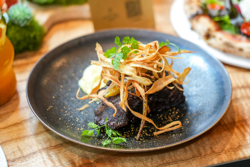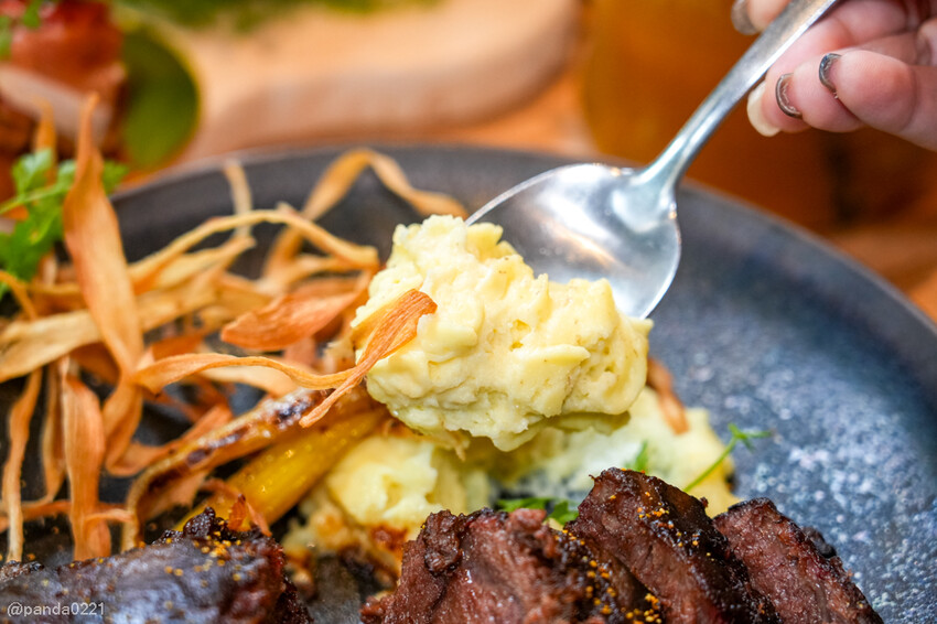 千絲暮雲慢燉和牛頰是一道吃一口就會愛上的低調系奢華。和牛頰肉燉得非常軟嫩,入口就化開,搭配酥脆的牛蒡和胡蘿蔔絲增添口感層次。旁邊的起司馬鈴薯慕斯綿密滑順,濃郁卻不膩口,讓整道菜吃起來更有平衡感。