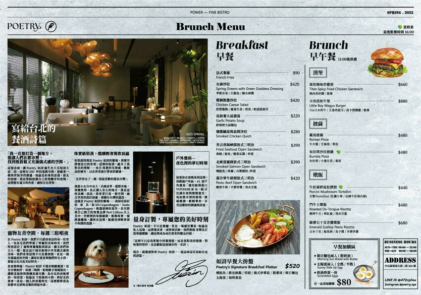 Poetry如詩的完整菜單需加收一成服務費,早午餐時段每人低消300元、晚餐時段為600元,用餐時間皆為兩小時。白天供應早餐與早午餐,最後點餐時間為 16:00,想喝調酒也能加點,另有提供甜點與各式飲品可選。我們這次是中午來訪,如果是晚上前來,則會有不同的晚間菜單,可點這裡查看。粉絲福利來囉!即日起到6/30,晚餐時段訂位,來店時只要說出通關密語「來如詩,躲一下」,就免費招待一份法式脆薯,別錯過這份小驚喜!