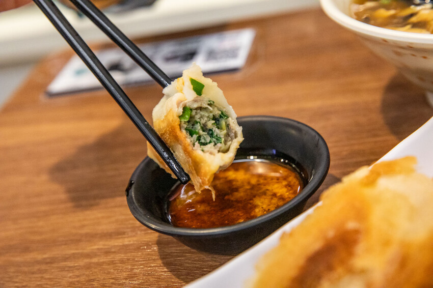 雖然來甲餃子的餐點都是現點現做,但是實際上菜速度還蠻快的,不需要等太久。我們點了韭菜和高麗菜兩種煎餃、酸辣湯還有炸醬麵,份量真的都給得很大方,尤其是煎餃,十顆就幾乎鋪滿了一大盤,視覺效果超棒。冰花煎餃真的做得非常漂亮,帶著焦脆薄翼的麵衣,用筷子就可以輕輕鬆鬆把餃子分開,筷子輕輕一碰,就能感受到冰花麵衣那種薄脆的獨特觸感,夾起一個餃子,你會發現那冰花薄到幾乎可以透光,光是看著就覺得好美喔。韭菜煎餃吃起來味道超甜,內餡也非常多汁,肉餡處理得比較細緻,搭配薄薄的脆皮,口感層次豐富,非常好吃。