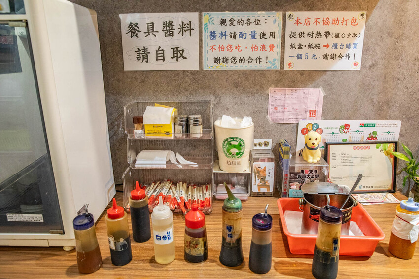 招牌必點的煎餃和水餃有兩種口味可以選,分別是韭菜和高麗菜,兩種口味都是十顆九十五元,價格非常合理實惠。用餐區後方就是沾醬、餐具和出餐區,沾醬和餐具都是採自助式,需要自行取用。另外,來甲餃子採用的是自助式用餐模式,吃飽飯後,餐盤要麻煩您自己回收喔,打包也是要自己來,現場有免費提供塑膠袋,如果您需要紙盒打包的話,則需要另外加價購買喔。