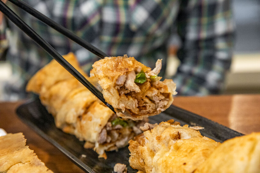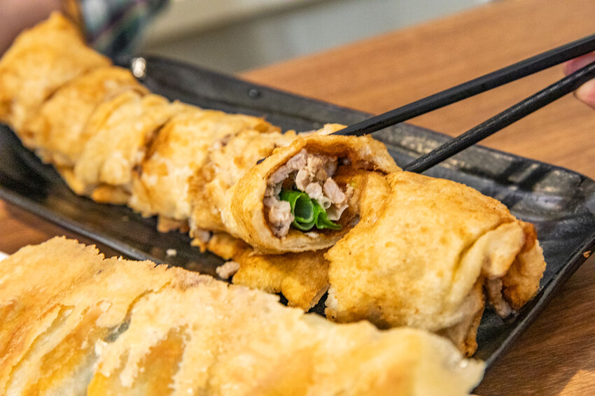 而高麗菜煎餃的水分也很多,加上那種甜脆的口感,就算不沾醬也一樣美味,如果您是愛吃辣的朋友,建議您可以沾一點來甲餃子特製的辣醬,微微的辣度吃起來會讓您更開胃喔。接著是豬肉捲餅,之前看過有人點牛肉捲餅,不過我們今天菜單上只有豬肉捲餅可以選,它的份量也超大一份。來甲餃子的餅皮跟我們一般常吃的那種用烙的捲餅不太一樣,感覺是用半煎炸的方式製作的,吃起來有點像是蔥油餅的感覺。外皮吃起來非常有彈性,表層還有微微的脆度,搭配裡面炒製過的豬肉餡和蔬菜,整體吃起來很是清爽,不過我覺得內餡的口味可以再重一點會更好吃,沾點醬料的話,口味上會更協調美味喔。
