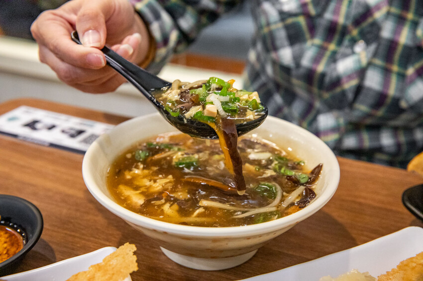 再來是炸醬麵,我們點的是小碗的,它是使用細拉麵做的炸醬麵,賣相看起來真的很不錯。來甲餃子的麵條口感非常Q彈,也能夠很好地吸附炸醬的味道,吃起來麵條滑潤有嚼勁,炸醬的味道鹹中帶點甜,還帶有一點濃厚的發酵豆香和肉末香,這真的是一碗很好吃的炸醬麵。而酸辣湯,則是非常真材實料,濃稠度也很適中,酸辣度也夠,是我目前喝過少數不需要另外調味的酸辣湯,味道調配得恰到好處。總體來說,來甲餃子確實非常不錯,實際吃過之後,我完全不難理解為什麼它在網路上的評價會這麼高了,尤其是他們的冰花脆皮煎餃,不僅吃起來酥脆,裡面還很多汁,加上個頭又很大,就算是大男生自己吃一份也超級飽足,分量十足。強烈推薦給所有愛吃煎餃的朋友們,來甲餃子絕對不會讓您失望的。