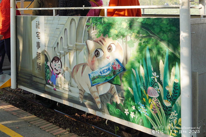 黃色火車頭搭配復古彩繪車廂,五分車車身上繪有高雄在地特色圖像,像是捷運站長-蜜柑、中山堂、防空洞、台糖冰棒等等,畫風童趣又可愛,車廂內部是簡易座位,保留原本載甘蔗的樣貌,因為是末班車,車上人不多,我們家就包了一節車廂,還可以悠閒拍照