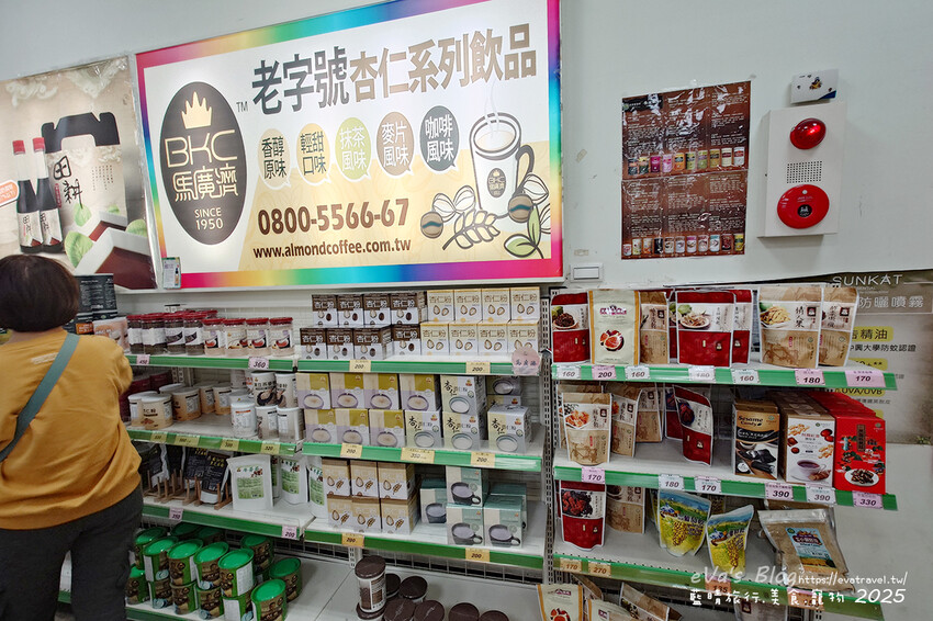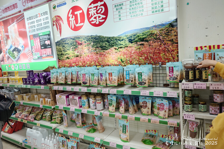 在這裡可以買到杏仁粉、芝麻粉、各種水果果乾、馬告辣椒罐頭、紅藜薑黃粉、三星蔥蛋捲和鹹蛋黃餅等等