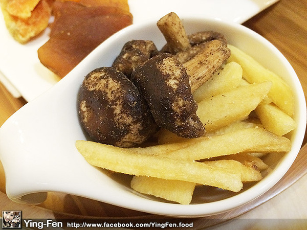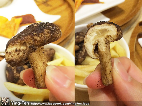 香菇聞起來好香,好酥脆的口感,味道非常香;旁邊的黑胡椒脆薯,吃起來超酥脆,有馬鈴薯的香味,帶有胡椒香味。