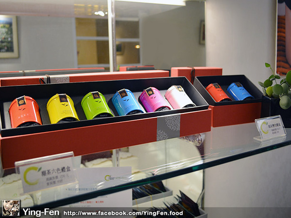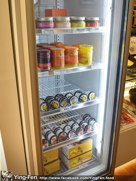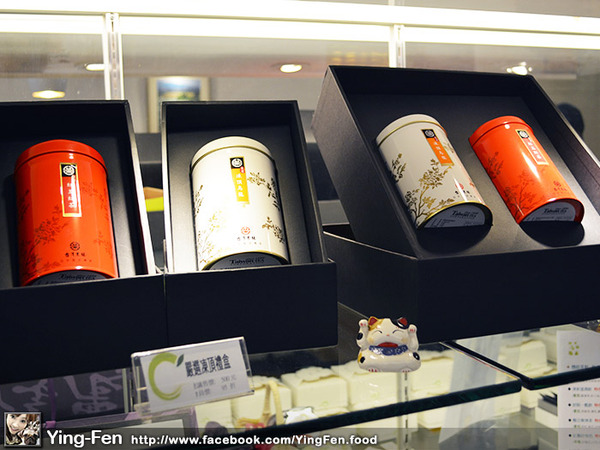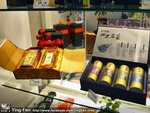 旁邊展示架上擺放一些茶葉罐和一些水果乾