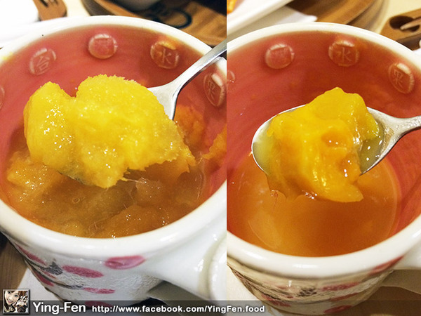芒果冰沙,有芒果果肉顆粒,吃起來酸酸甜甜味道,QQ口感,溶化變成水,喝起來芒果味道好濃郁像在喝芒果濃湯。