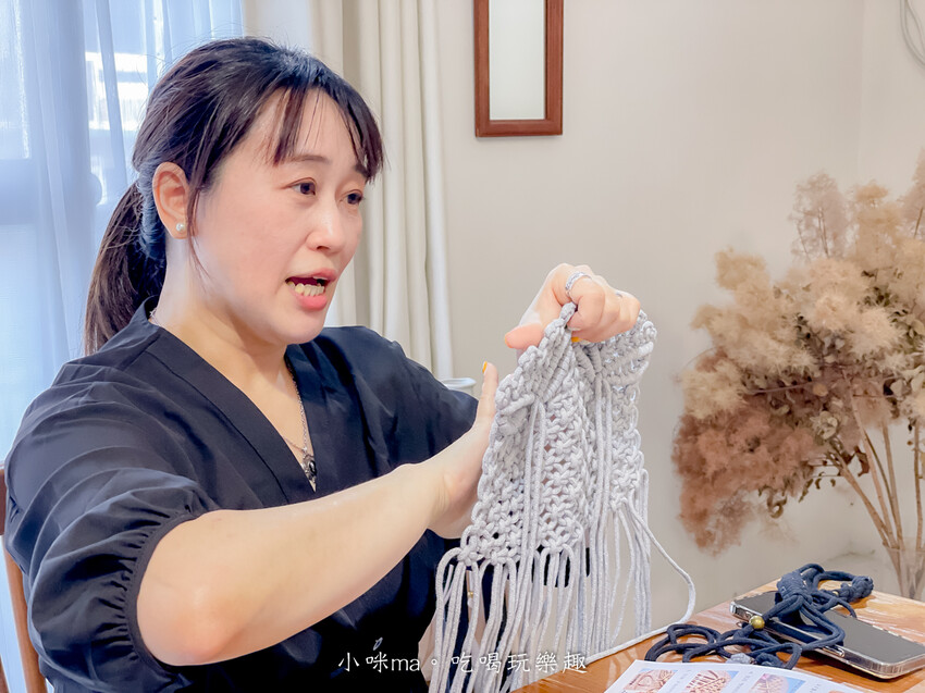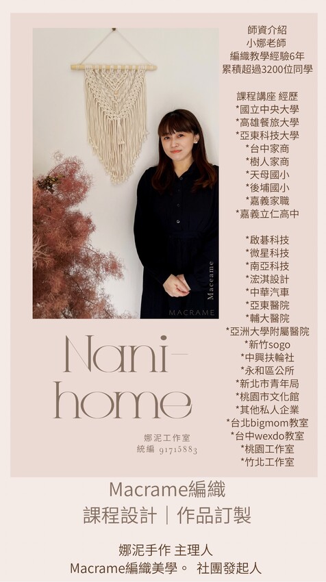 小娜老師原本是做泥作起家,因為興趣開始鑽研手作編織,至今已經超過6年,也是編織美學 macrame的發起人,老師不藏私手把手的教學方式深受很多人喜愛,像他的手機鍊課程已經昇華到2.0,一次可以學會20種編織法,許多同學上了這堂課都斜槓副業成功喔~超強的