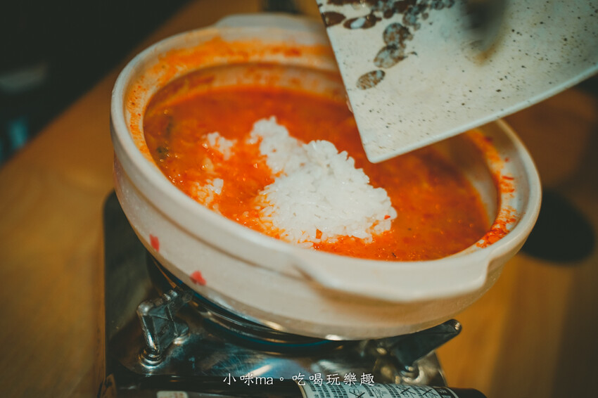 聊到又有點餓了,來~牛腸鍋馬上煮粥繼續吃,放進白飯,打上一顆蛋花,超完美的牛腸鍋粥就完成啦!