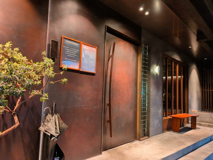 店外觀十分的低調,昏黃的燈光下紅銅色的大門及建築物連為一體