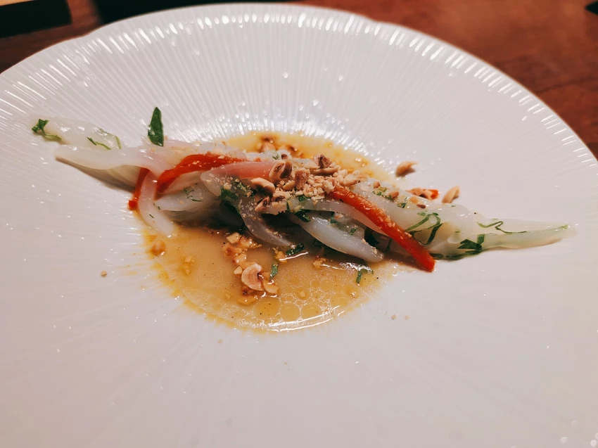 細絲狀的花枝,搭配烤甜椒絲,佐上紫蘇果醋,果醋的酸味帶出花枝的鮮甜