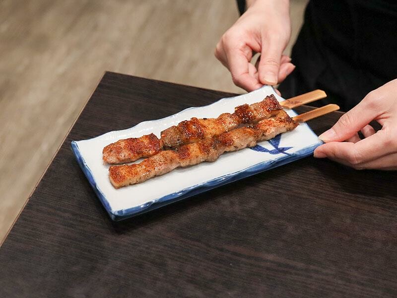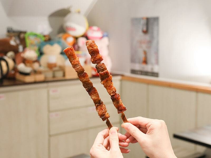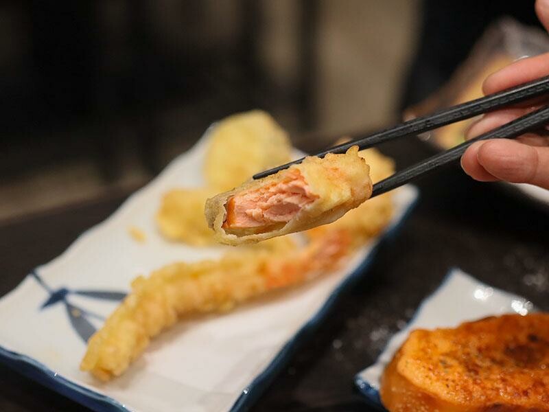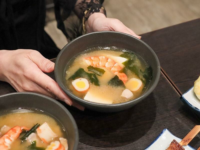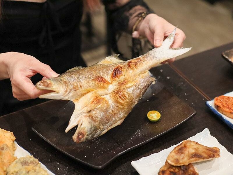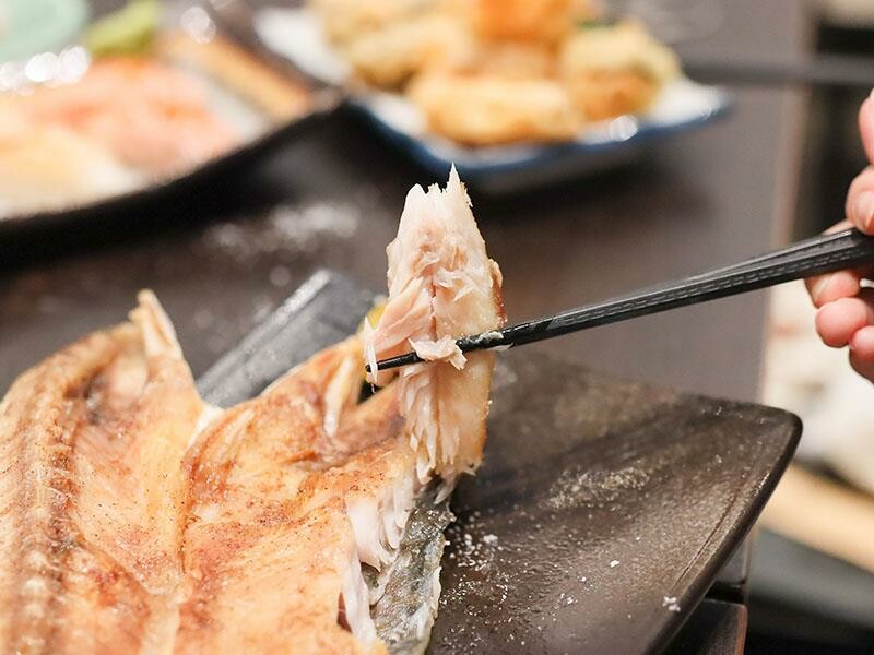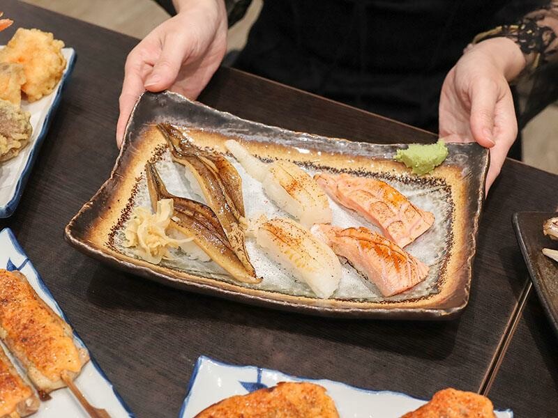 一個人的合菜套餐真是「I人」們用餐的最佳選擇。這也適合那些想品嚐多樣菜色,但又不想吃太多的族群。一個人可以獨自享受美食,不用擔心吃不完造成浪費。只要八百八十元起,就能從開胃菜、主食、生魚片、壽司、熱食一路品嚐到甜點。菜色的精緻度完全不打折扣,份量也絕不會虧待您。多道菜色的搭配,提供了滿滿的飽足感與豐富性,即使是一個人用餐,也能享受到非常理想的用餐體驗。以八百八十元兩人份的合菜套餐為例,首先會品嚐到明太子法國麵包。這款厚切法國麵包經過烘烤後,表面鋪上厚厚的明太子醬,外皮微脆,內部則保持著柔軟濕潤的口感。咬下去時,明太子的鹹香與微辣在口中化開,搭配麵包本身的嚼勁,整體油脂感清爽不膩口。接著是令人驚喜的大草蝦味噌鮮魚湯。原本以為草蝦是主角,但湯匙一舀才發現,整碗的鮭魚肉份量多到驚人。魚肉塊很多,而且燉煮得恰到好處,保持著魚肉的纖維與嫩度。味噌湯頭喝起來不死鹹,反而帶點鮮甜滋味。極上生魚片三切當天提供的是鮭魚、青甘和旗魚。這些生魚片都是現點現厚切後溫熱上桌的。鮭魚的油脂分布均勻,入口即化。青甘則是滑順中帶有韌性。旗魚的口感偏扎實,但一點也不乾柴。這三種魚肉的口感層次分明,搭配芥末和醬油剛剛好。炙燒握壽司有三貫,分別是比目魚、星鰻魚和鮭魚。其中炙燒比目魚是我個人最愛的一貫。豐厚的油脂經過炙燒後,表面帶有一點點的焦香,與醋飯的酸度搭配得恰到好處。星鰻魚咀嚼時,甜味會慢慢地浮現出來。鮭魚握壽司的口感則保持著潤澤感,是一款表現穩定、讓人安心的選擇。炸玉米手卷外表焦香,玉米本身的甜味很明顯。加上生菜絲和沙拉醬提味,口感酥脆,是一款輕鬆又美味的小點。綜合天婦羅包含了草蝦、魚片、香菇和櫛瓜。麵衣炸得非常乾爽,吸油量很少,沾上醬汁後,甜味會更加明顯。草蝦是現剝去殼的,吃起來爽脆有彈性。這次使用的魚片居然是厚切鮭魚,外酥內嫩的口感非常加分。香菇整顆多汁飽滿,櫛瓜則清甜解膩。整盤天婦羅搭配得恰到好處,讓人感到滿足。烤明太子雞肉串可以說是竹北馬的生食丼的代表作之一。雞肉烤得非常多汁,沒有過熟的乾柴感,上面鋪的明太子超級濃郁。吃完真的會讓人想再點一串。烤豬五花肉串則帶點焦香,油脂比例剛剛好。咬下時,會感受到外皮的酥脆和內層的軟嫩脂香。烤午仔魚一夜干或是青甘魚下巴也是套餐的選擇。單人合菜搭配的是一整隻午仔魚一夜干,如果兩人一起點,第二個人就會搭配青甘魚下巴。午仔魚的外皮酥脆,魚肉細嫩沒有腥味。青甘魚下巴則是另一種層次的飽滿,肉量非常驚人,連骨邊肉都能讓人慢慢啃得很開心。