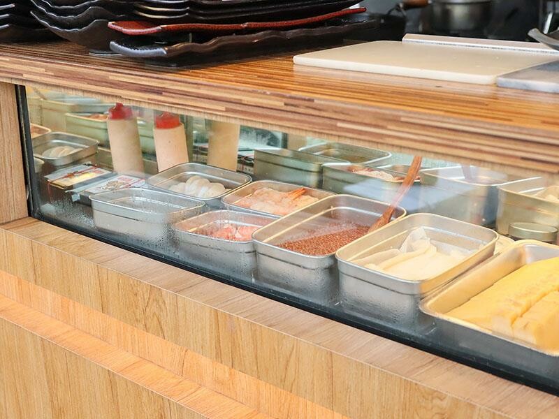 竹北馬的生食丼就座落在竹北縣政二路上。最引人注目的,就是招牌上那位飛機頭人物了。停車非常方便,斜對面就有一個「好庭車」停車場,步行不用五分鐘就能抵達餐廳。走進店內,會看到冰箱櫃裡整齊排列著新鮮的生魚片,像是鮭魚、鮪魚、干貝、甜蝦等等,每一塊都看起來非常新鮮。料理台前的師傅們手腳俐落,現場炙燒、擺盤,就像在欣賞一場小型的板前秀一樣。店裡的空間走的是家庭式的簡約風格,明亮的牆面搭配柔和的光線,營造出輕鬆又沒有壓迫感的用餐氛圍。桌子的擺放也很靈活,可以依照用餐人數來調整。最可愛的是,自助取用的餐具和開水區域,居然擺放了好多娃娃來「鎮守」,給人一種莫名的可愛感呢。