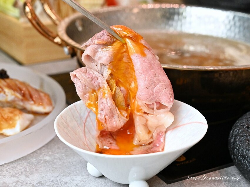 A5和牛紐約客一上桌就氣勢十足,切得相當大片,油花分布細緻均勻、色澤鮮紅誘人,輕涮幾秒即可入口,肉質柔嫩多汁、油脂豐盈卻不膩口,入口即化之餘還保有紐約客特有的紮實咬感,濃郁肉香在嘴裡久久不散