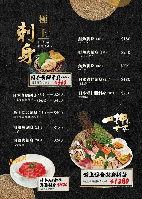 豪華海鮮散壽司宛如海洋珠寶盒,裡頭包含油脂豐潤、入口即化的青甘腹與鮭魚腹,肉質細緻、濃郁鮮甜的黑鮪魚,還有晶瑩剔透、口感Q彈甘甜的葡萄甜蝦,北海道海膽綿密濃郁、海味十足,真鯛鮮嫩滑口、帶有淡雅清甜,鮭魚卵在口中顆顆爆開,鹹香交織,讓每一口壽司都充滿層次與驚喜