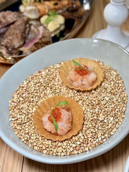 走進FORE直火料理餐廳,你會發現這裡的用餐環境充滿了硬性質感的金屬元素,大片落地窗引入自然光線,整體線條簡潔,低調卻顯得很有質感,同時又用溫暖的木質調燈光和餐桌椅來柔和整體空間,讓你感覺非常舒適。餐廳正中間就是開放式廚房,擁有專業廚具,現場飄散著滿滿的柴燒香氣,這裡也很適合喝杯小酒放鬆身心喔。他們還設有六到十六人的包廂,如果你有需求可以直接洽詢店家。在開放式廚房的吧台區,你可以近距離欣賞主廚料理的每一個瞬間,從料理過程中直接感受到視覺和嗅覺的饗宴。FORE直火料理擁有專業的柴燒爐具,左側是斥資百萬打造的特殊燒窯「蓄炭爐」,專門用來燒烤龍眼木,等到柴火燒到五百多度高溫,才能用來炭烤食材。由於直火料理對火候控制的經驗要求非常高,需要依據肉品在不同階段所需的火力,來調整肉品烤架的位置與高度,所以他們採用特製的「手調式烤爐」來烤制食材,就是為了確保料理能保有最佳風味。主廚會將海鮮及肉品放入磚窯內直火燒烤,炙熱的大火帶著微微飄散的龍眼木香氣悄悄融入食材中,呈現出肉品自然的紋理和精緻色澤,創造出無法複製的獨特迷人風味。此外,他們還有專業的恆溫酒窖,收藏了來自世界各地的眾多酒款,包含紅酒、白酒、香檳、氣泡酒等,可以滿足各種餐點搭配的需求喔。