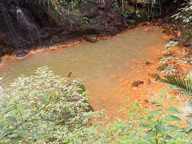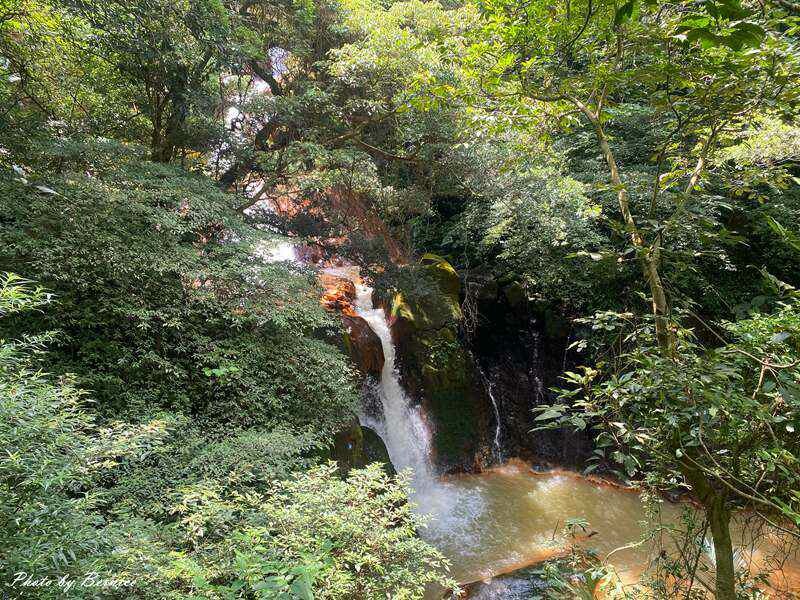 步道的終點是松溪瀑布,這裡設有觀瀑平台,雖然無法與瀑布親近,但依舊可以感受到瀑布的磅礡氣勢;瀑布為溫泉水,一路流經的岩壁與溪流均呈現紅褐色