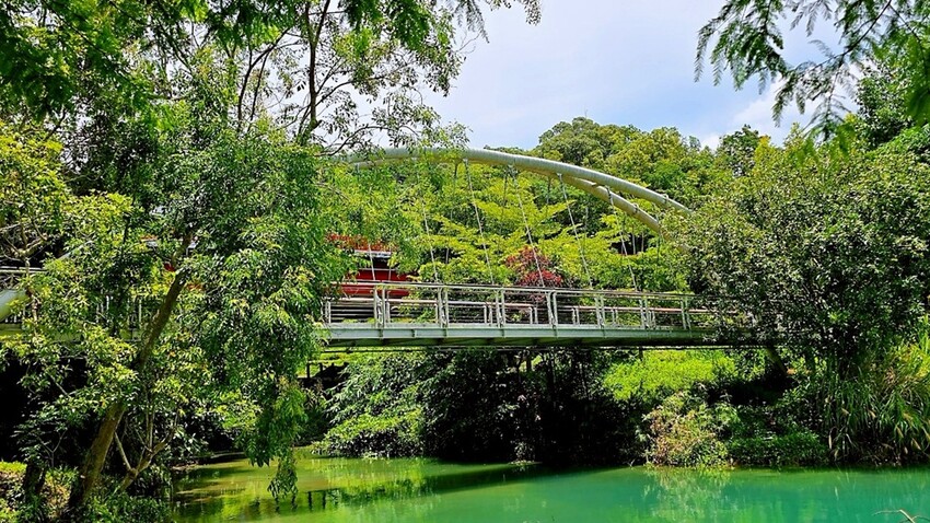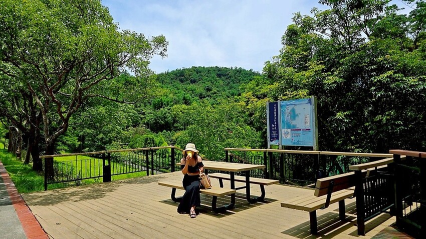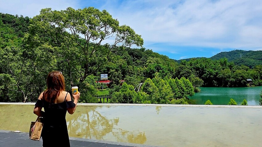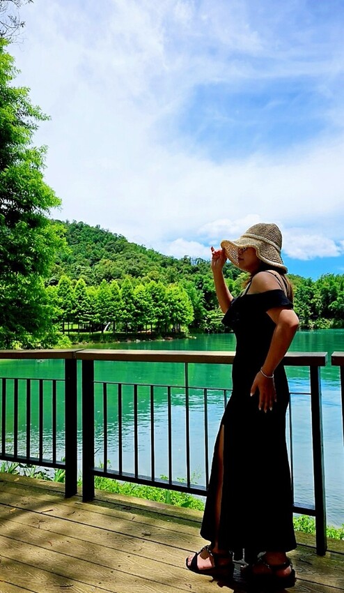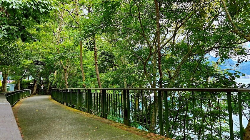 沿著遊客中心後方往上走,您會發現景色更加遼闊,視野極佳。天氣炎熱時,也可以到室內逛逛吹冷氣。沿著人潮方向,就能抵達美麗的落羽松區域,雖然這次造訪時落羽松尚未變黃,但翠綠的景色也自有其魅力。愛心花圃更是許多人爭相取景的熱門打卡點,拍照起來超級漂亮。這裡不只可以通往向山遙望平台,也能沿著日月潭環湖自行車道騎腳踏車賞景,沿途指標清晰,完全不用擔心迷路的問題。