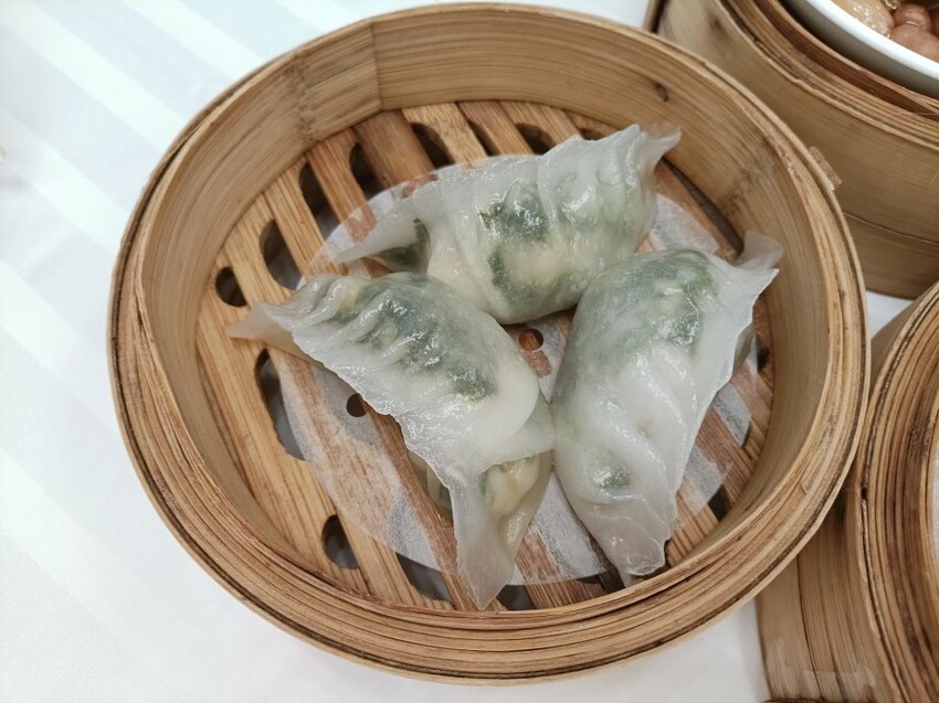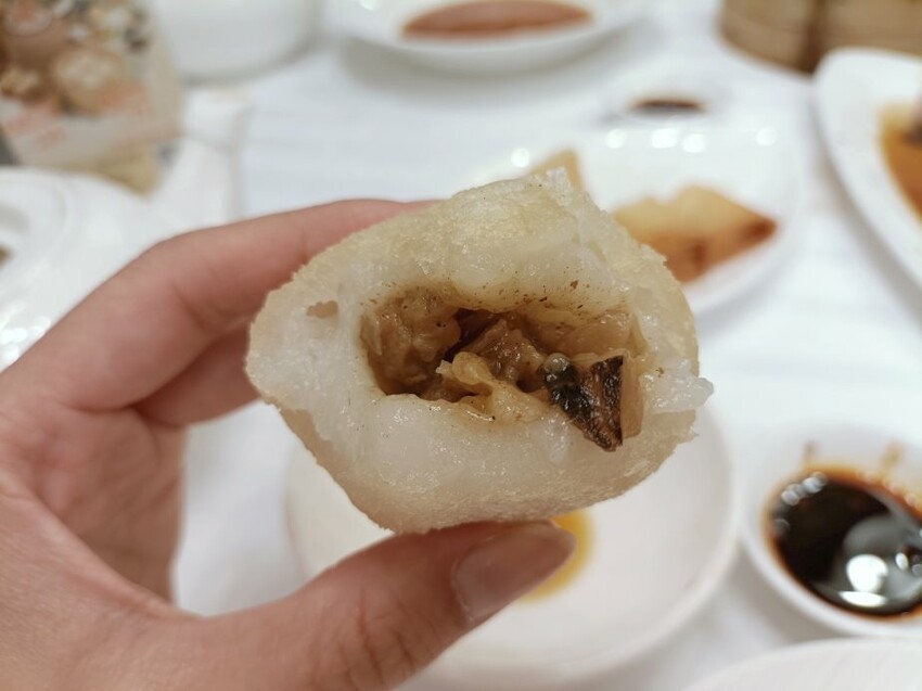 吃港點當然要配上一壺熱熱的茶,我個人習慣喝香片呢,首先上桌的是涼拌雲耳,吃起來帶點醋的微酸,口感微脆又微彈,非常適合夏天當作開胃小菜,接著是紫金醬蒸鳳爪,這鳳爪蒸煮到軟爛,卻還帶有一點Q度,味道甜香甜鹹的,非常好吃,說到港點,水晶鮮蝦餃皇絕對是必點,港澳的蝦餃蝦子都是放大版的,蝦仁都超大隻,肉質有厚度又富有彈性,差不多是台灣蝦餃蝦仁的兩倍大呢,還有瑤柱菜苗海鮮餃,透明的餃子皮透出翠綠的蔬菜,裡面的蝦仁就佔了整個餃子的三分之二,外皮Q彈,蝦仁有彈性,蔬菜提味,表現一點都不比蝦餃遜色喔。