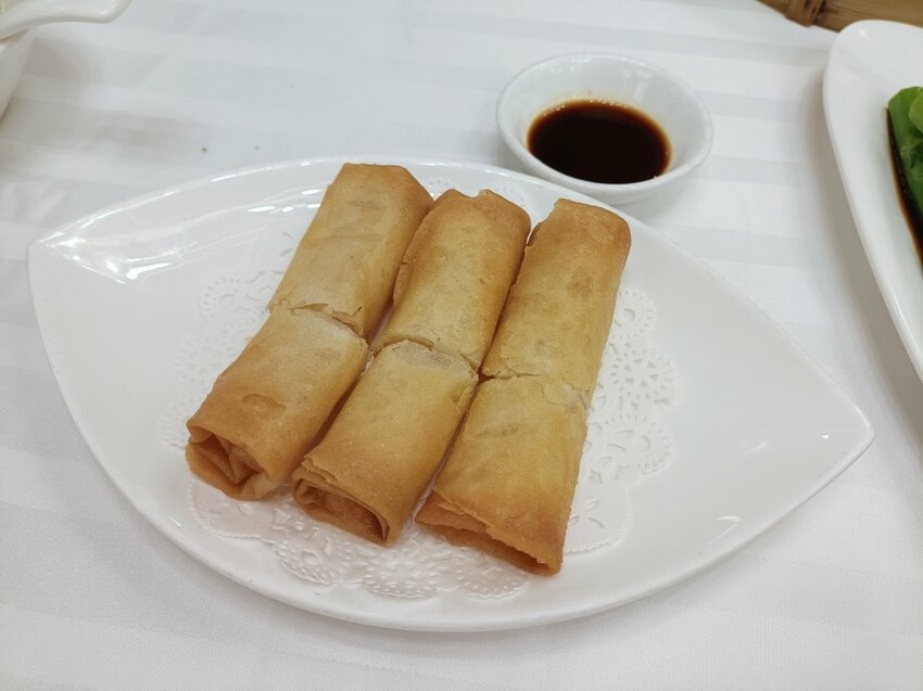 我們也品嚐了豉汁蒸排骨,排骨外層有裹一層薄薄的粉,排骨吃起來嫩又多汁,不過吃的時候要小心骨頭,香莤牛肉腸粉也是一道美味,牛肉的粉嫩紅色透過腸粉皮透出來,綠色蔬菜搭配成鮮明的對比色,牛肉餡有裹粉,吃起來嫩帶滑,腸粉則綿而彈,真的很好吃,炸蝦春捲雖然炸到酥脆,內餡的蝦仁也又多又新鮮,可是我們比較偏愛腐皮蝦捲,所以對這道就覺得普普通通,而白灼生菜雖然看起來很普通,但湯汁鮮甜加上蔬菜清脆,我們馬上就吃光了呢,家鄉鹹水餃的炸功了得,外皮的功夫更是讚,一咬下去熱到會冒煙,外皮炸到酥脆,中間像麻糬一樣又Q又彈,內餡鹹香鹹香,這完全是我的菜啊。