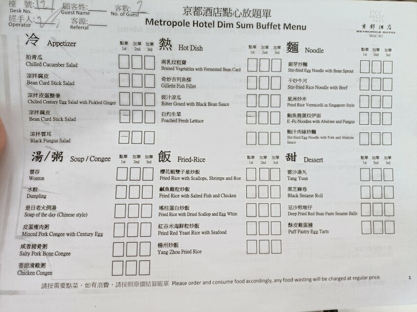 我們和姐姐來到澳門玩耍的第一天,決定要睡到自然醒,一次解決早餐和午餐,因此我們來到位於澳門本島市中心的澳門京都酒店,享受午餐任食港點,也就是說,這裡可以港點吃到飽喔,哇,這裝潢真的就是小時候爺爺奶奶家的古早味風格呀,不過,可別小看這間澳門京都酒店,它資歷老,來用餐的客人超級多,我們上午十一點半抵達,到中午十二點的時候已經客滿了呢,這裡的粵式點心菜單上所有能吃的下的餐點,你都可以盡情的點用,想吃什麼就點什麼,不過請大家記得不要浪費食物,如果有浪費可是會按照原價結算帳單的喔。