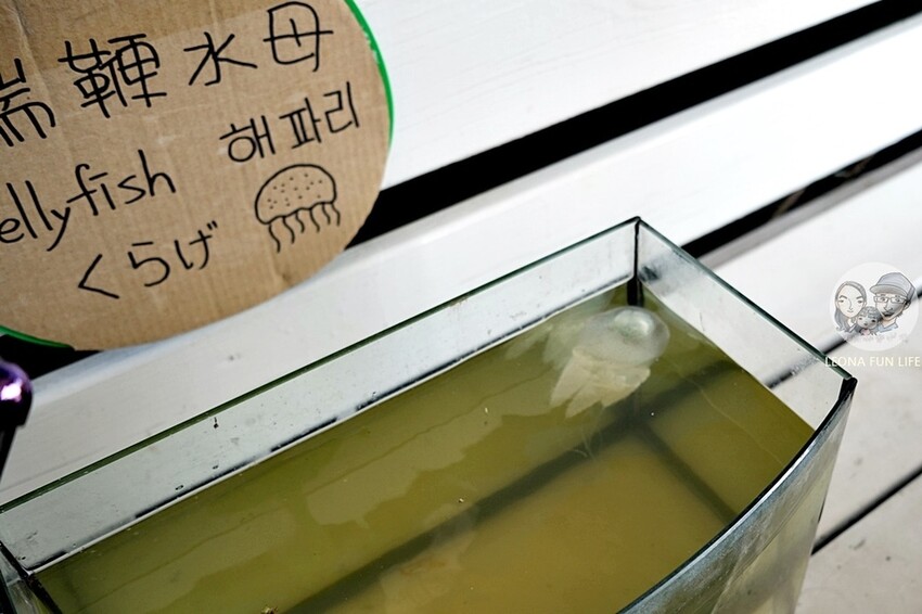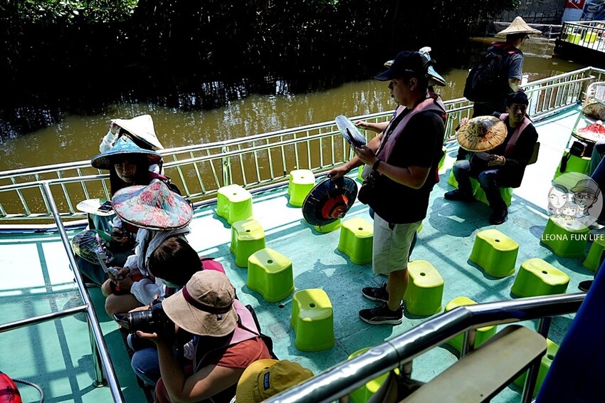 如果是團體預約,就會直接集合登船,先聽注意事項,然後一起穿上救生衣,大人小孩都有提供喔,就可以準備上船了。在穿救生衣的時候,他們也會介紹四草湖一帶的夢幻小精靈「端鞭水母」,它也被稱為四草水母,因為在行進間不容易發現,所以會特別展示在乘船區給大家看。穿好救生衣後就依序坐上竹筏上的小板凳。因為水道兩旁的樹木長得非常茂密奔放,坐在竹筏兩側的朋友在經過林蔭區時,可能需要稍微閃避一下樹木,所以兩側的座位會比較刺激喔。旁邊也會提供小斗笠,如果沒戴遮陽帽的朋友記得拿一頂,像我們去的那天艷陽高照,沒斗笠真的會曬乾。