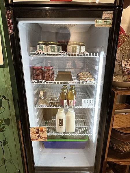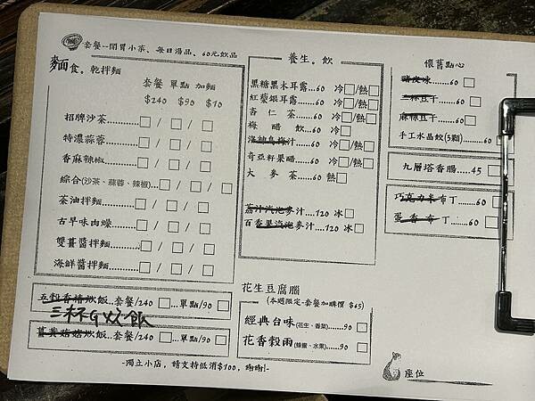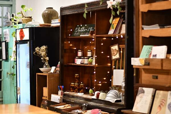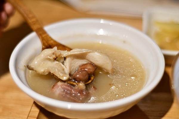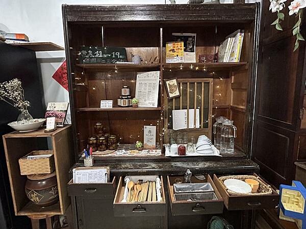 西藥房的一樓販售著文創商品和小點心,這裡還能看見一些以前留下來的古董擺設。麵店設在二樓,大家需要脫了鞋子,小心翼翼地爬上樓梯。每一步都像在翻開歷史課本,一頁頁地細訴著這棟老屋的歷史和故事。二樓的用餐空間非常美麗,以前的房間床架被改造成了榻榻米和室,讓人想起兒時外婆家的房間。坐在榻榻米上用餐,感覺非常放鬆。以前的木櫃衣櫃裡擺滿了各式圖書,瀰漫著一股濃厚的文青氣息。這個空間裡到處都充滿了故事,讓人覺得很有意思。那些復古的家具和擺設,彷彿觸動了我們童年的記憶,許多經歷過的畫面都浮現出來。這些觸動人心的家具,感覺就像是阿嬤珍貴的嫁妝。點餐和備餐的櫃檯,是用復古的玻璃花窗組成的,顯得古色古香。餐具和開水都是自助式的,店裡也有販售醬料和釀製類的食品。餐點主要供應乾拌麵、三杯雞炊飯、飲品、花生豆腐腦和懷舊小菜。乾拌麵可以單點,也可以選擇套餐。我點的是香麻辣椒乾拌麵套餐,裡面附有小菜、飲品和湯。香麻辣椒乾拌麵上擺放著豆芽菜、青蔥,還有一片九層塔香腸。香腸雖然小小一片,但九層塔的香氣讓這古早味的香腸顯得特別。香麻辣椒口味的乾拌麵其實沒有想像中那麼辣,店家有說如果不夠辣可以再加。但我個人喜歡這種剛剛好的滋味,搭配剛剛好Q彈的麵條。然而,最讓我驚豔的,竟然是套餐附贈的那碗湯。