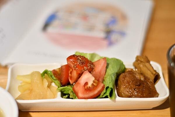那碗是中藥排骨湯,裡面有排骨、花生和豬肚。雖然我有點分不清楚那是豬肚還是杏鮑菇,但我確實覺得湯頭有豬肚的香氣。湯頭非常濃郁,除了豬肚和排骨的精華之外,還帶有淡淡的中藥香,充滿了古早味。套餐附贈的小菜也毫不馬虎,有醃蘿蔔、薑汁番茄和滷車輪腐竹,這些全都是阿嬤的拿手小菜,帶有熟悉的老味道。飲品我選擇了黑糖木耳露,原本以為會很甜,但它的甜度很低,卻又非常濃郁,非常好喝。整份套餐我都全部吃光了,每一道都非常美味。我邊吃麵邊看著新化的故事繪本,對新化這個地方有了更深的認識。這間店的經營者非常致力於在地文化的保留和推廣,讓在地的故事和文化得以延續下去,也讓更多人認識屬於台灣的故事,我非常佩服他們的付出。立賀佇遮的餐點,不只讓我們品嚐到古早味,還吃到了最天然健康的滋味。雖然乾拌麵套餐看起來價格不算便宜,但整個餐點的質感和味道,都讓我覺得非常值得。