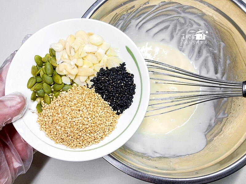 製作芝麻南瓜子脆餅的步驟其實非常簡單,首先要將糖粉仔細過篩,然後加入到蛋白盆中並且打拌均勻,接著將無鹽奶油隔水加熱直到它完全融化,等到融化後的奶油溫度下降之後,再將它加入到蛋白糖液中仔細拌勻,接下來加入已經過篩的低筋麵粉並且再次拌勻,最後再將準備好的堅果加入,然後用刮刀仔細拌勻之後,覆蓋起來並且放到冰箱中靜置大約三十分鐘到四十分鐘的時間。