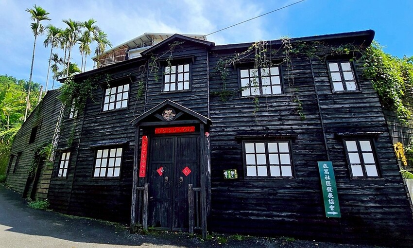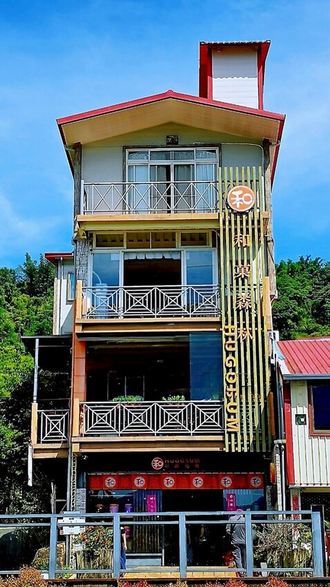 和菓森林紅茶莊園建築外觀以原木色調為主,搭配大片玻璃窗與簡約線條,靜靜地坐落在綠意圍繞之中,與日月潭的自然景致完美融合。