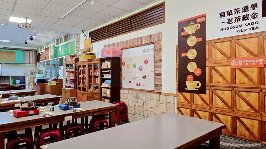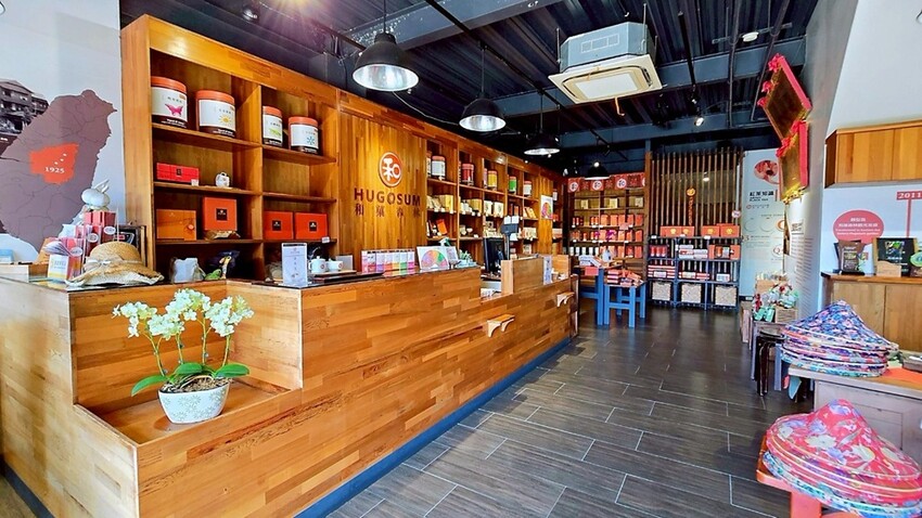 走進日月潭和菓森林紅茶莊園,彷彿置身一處溫潤質樸的茶香天地。空間主體以溫暖木質打造,牆面與櫃體皆採用原木設計,傳遞出一種沉穩且充滿人情味的氛圍。這邊還有擺設著不少台灣風格的元素,如斗笠與茶葉介紹看板,展現在地文化與品牌故事的結合。