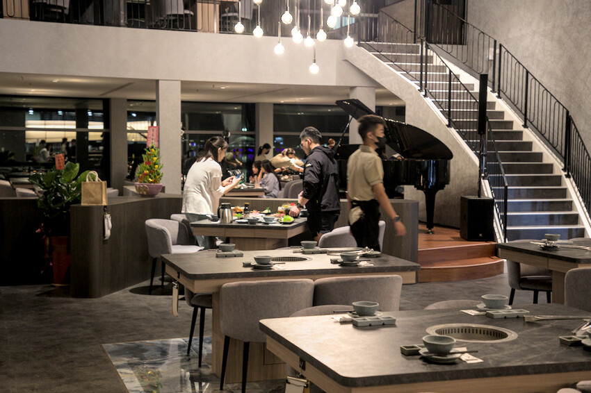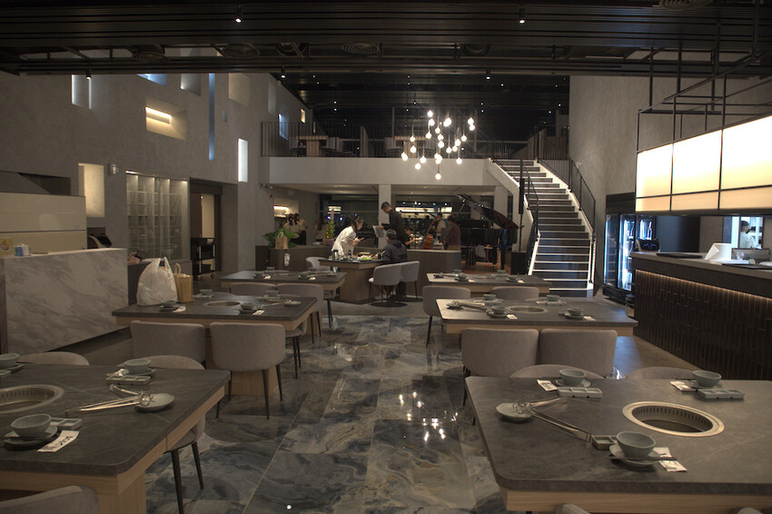 這間店的裝潢很有質感,採用了木質與深色調的搭配,呈現出低調奢華的風格,大理石紋理地板與灰調牆面更是提升了整體氛圍。店內空間挑高,還有樓中樓的座位設計,讓你看起來空間感十足,不論是兩人約會還是多人聚餐,這裡的座位都非常舒服。每桌都配備了圓形的炭火烤爐,烤肉的時候香氣四溢,而且中央還有一個黑色平台鋼琴和舞台區,晚上會有現場表演,讓你的用餐體驗更有儀式感。
