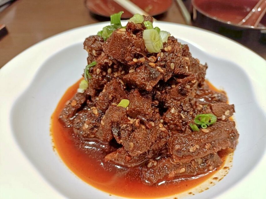 在上菜之前呢,店家會先送來三小罐東西,分別是酸豆、鷹嘴豆和辣椒醬。酸豆搭配重口味的川菜,可以幫忙減緩味蕾上的衝擊。至於鷹嘴豆和辣椒醬,因為菜色本來就夠辣了,所以我們就沒有特別去動。我們簡單點了四個菜,其中「麻醬油麥菜」搭配濃郁的胡麻醬,跟青菜真是百搭,一下下就被我們姊妹倆吃光光。另一道「麻辣牛肉條」真的是超級夠勁、夠味,吃起來比一般零食的牛肉條還要軟,但還是很有咬勁。這道真的是又麻又辣,有喝酒的朋友,這道下酒菜絕對是必點的。