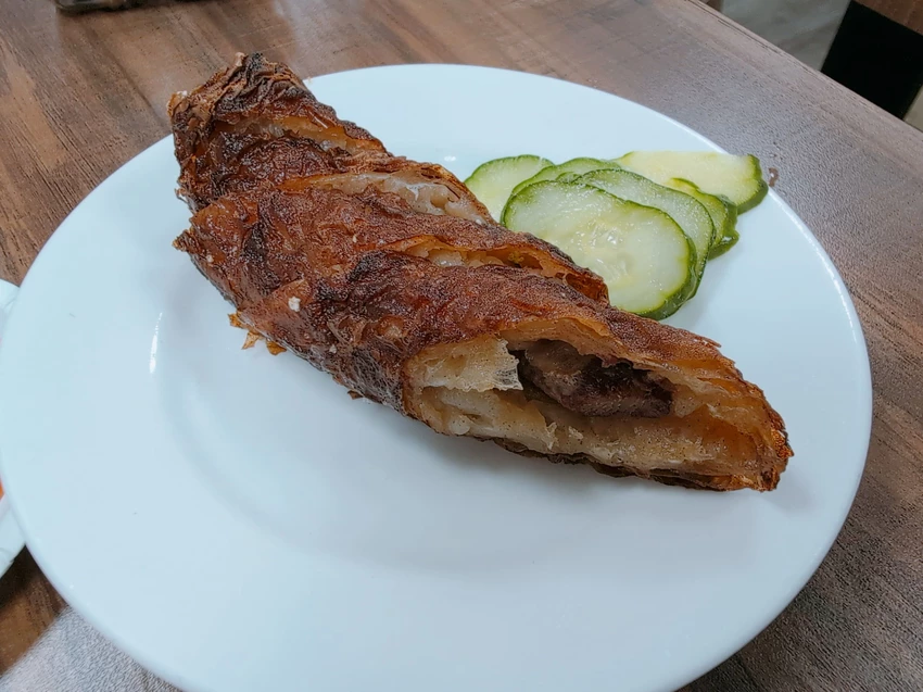 首先上桌的是雞捲,可以配著旁邊的酸黃瓜一起吃,