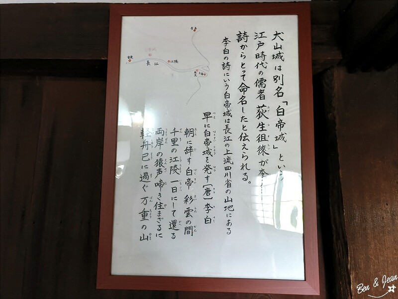 犬山城是日本戰國時代武將織田信長的叔父織田信康於西元1537年修築的,他是犬山城的初代城主,如今只剩下天守閣了。天守閣內樓梯非常陡峭,設計上除了節省空間,也能阻礙入侵者。走在光滑的木地板上,木板發出嘰嘰嘎嘎的聲音,彷彿能感受到當年的歷史氛圍。我們走到最頂樓的望樓,那裡可以將木曾川、御嶽山等360度的美景盡收眼底,木曾川這段流域更被譽為「日本萊茵河」,並獲指定為國家級的名勝。天氣好的時候甚至能看到名古屋車站的高樓。犬山城又被稱作「白帝城」,這個名字是江戶時代的學者引用唐朝詩仙李白的詩作「早發白帝城」而來,形容犬山城的絕色景致如同長江沿岸的白帝城一般,坐擁千里江陵、覽遍輕舟萬山,真的非常值得一遊。