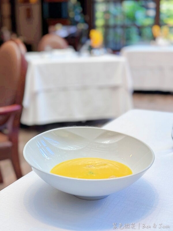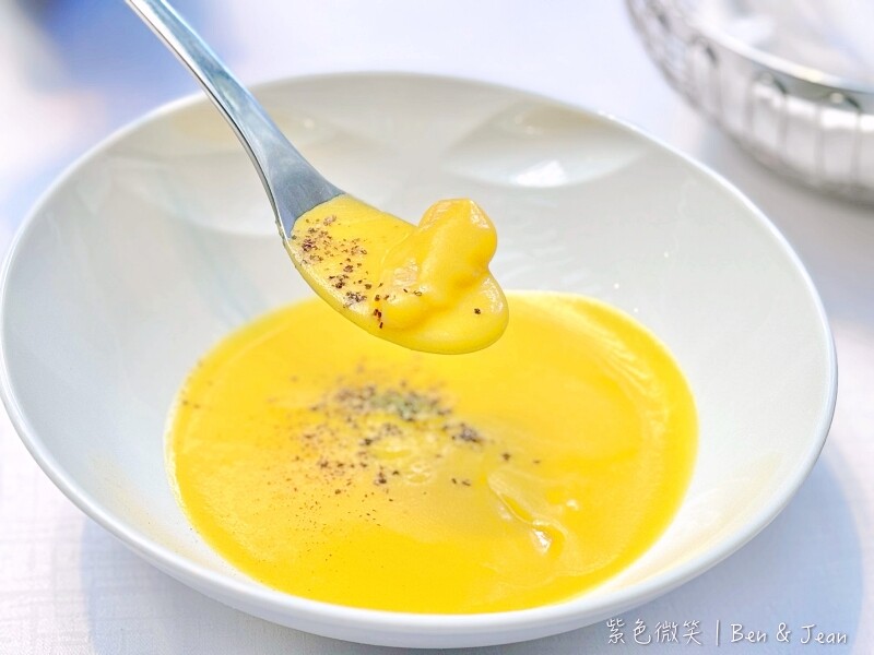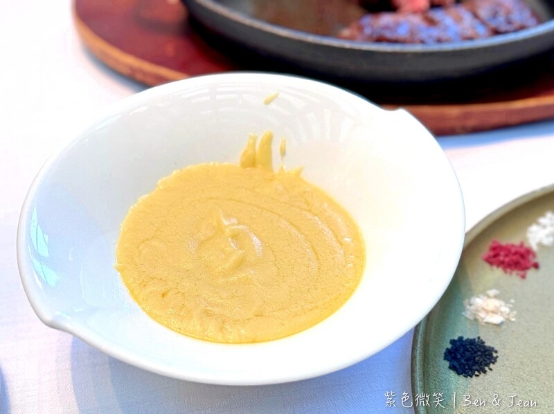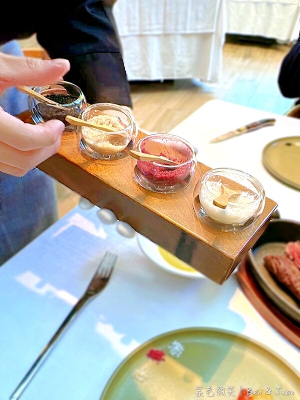 在用餐體驗上,您可以選擇礦泉水或氣泡水,水費每人九十元。首先送上的是熱騰騰的餐前麵包,搭配桌上的黑蒜奶油香氣濃郁口感滑順。接著是花園經典沙拉,擺盤賞心悅目,清爽可口,加入鹹香火腿更是迷人。主廚每日例湯,這次品嚐到香醇濃厚的蘑菇濃湯或是芳香濃郁的南瓜濃湯,南瓜濃湯中間還有個小小麵疙瘩,真的喝完口齒留香。紐西蘭羊排口感超嫩,愈嚼愈香,切到最後您甚至可以直接拿起來啃,嚐嚐它的焦香,真的是好好吃。這裡還提供芥茉、紅酒、火山、玫瑰鹽四種鹽,每種都有不同風味,為肉品增添不同的風味變化。