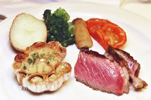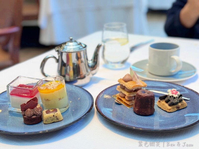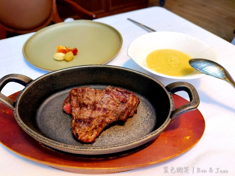 主角美國PRIME溼式熟成三十天老饕牛排六盎司,是店家推薦的三分熟度。這個部位是順著肋眼牛肉筋膜切下的上蓋肉,因此量少且非常珍貴。雖然是三分熟,但卻沒有一般牛排的血水,而是呈現口感滑嫩鮮甜、肉汁滿溢的感覺。牛排會以鑄鐵盤承裝,本身帶有餘溫會慢慢加熱,搭配加了奶油的滑順薯泥更是美味。最後的甜點時間非常特別,服務人員會推出甜點餐車到桌邊服務,每個人都可以任選四種精緻甜點,例如美味的可麗露。這些精緻可口的甜點,搭配咖啡或熱茶最對味了,例如伯爵茶或美式咖啡,為這頓饗宴畫下完美句點。