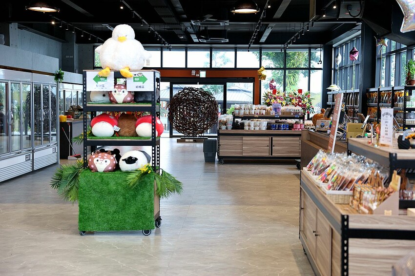 除了與萌寵互動,鹿芝谷的設施也非常完善,園區內設有觀景台,可以遠眺連綿山巒美景,傍晚時分更能欣賞到壯麗夕陽餘暉。如果玩累了,可以在販賣亭買支紅豆牛奶冰或夾心冰淇淋稍作休息,或者到室內區域,這裡規劃了咖啡廳、熟食區、伴手禮區和下午茶區。你可以選購當地特色產品,像是香菇、金針菇、洛神花等等,也能在明亮寬敞的空間裡悠閒享用飲品或點心。二樓的用餐區還有室內外景觀座位,讓大家一邊品嚐水豚君咖啡或笑笑羊咖啡,一邊欣賞窗外山景,享受愜意時光。