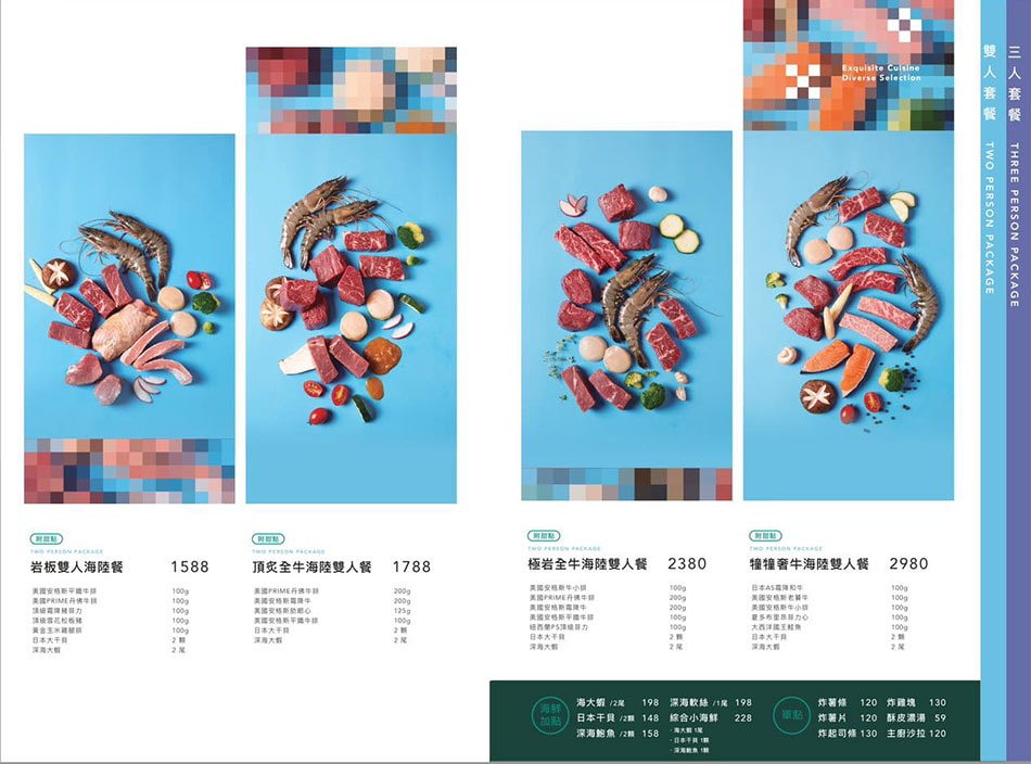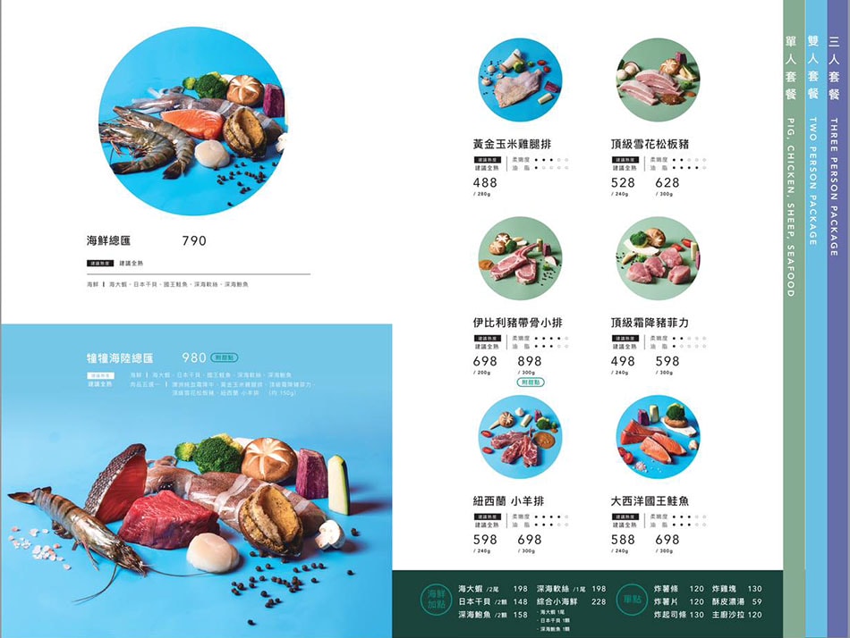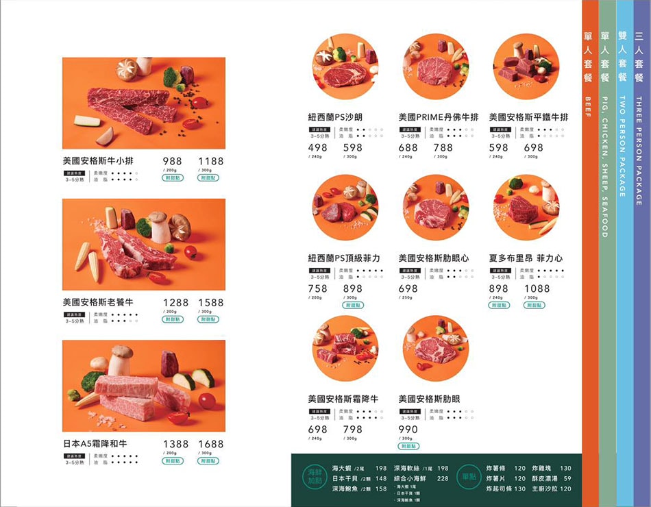 在犝犝燄牛排館,菜單選擇可說是相當豐富,無論您是單獨用餐,還是跟家人朋友聚餐,都能找到適合的套餐。個人套餐的牛排價格從498元起跳,最貴到1688元都有,選項很多樣。如果您不吃牛肉,這裡也有雞肉、豬肉跟海鮮類的選擇,可以好好參考那一頁。此外,這裡還提供了四款雙人套餐,價格從1588元到2980元不等,很適合情侶或兩位朋友共享。而三人套餐目前有一組,價格是2680元,滿足不同人數的聚餐需求。