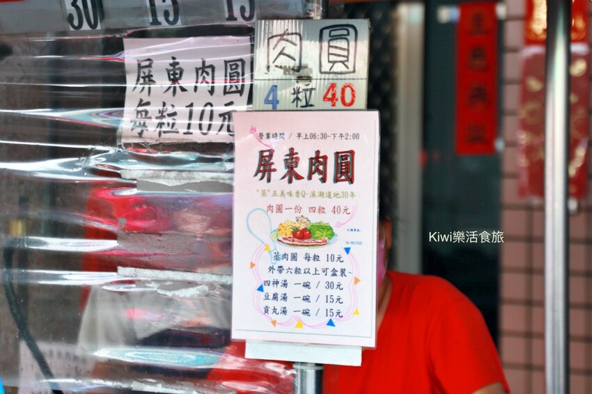 來到這裡,這家屏東肉圓的菜單也很親民喔。一份屏東肉圓裡面有四顆,只您40元。除了肉圓,您還可以搭配一碗溫暖的湯品,像是30元的四神湯,或是15元的豆腐湯、15元的貢丸湯,價格都相當實惠。在攤子前面,您會看到一個大大的蒸籠,肉圓就是在這裡面蒸熟的。旁邊還有工作人員在現場包肉圓,新鮮程度絕對讓您看得見,每一顆生肉圓都包得飽飽的、很可愛呢。