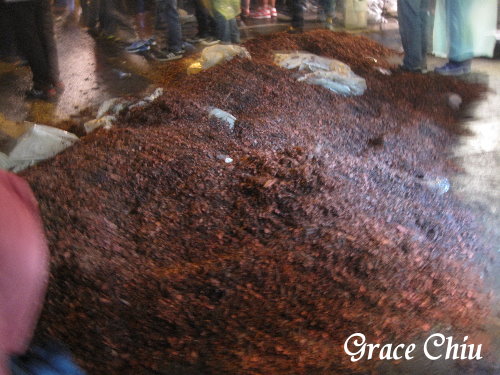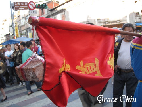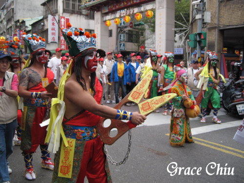 先四處走走再來決定停留地點,期間看到~環河南路廣州街口推滿了砲渣,看來是經過一番非常精采的炮火陣吶/青山宮紅壇前有一組隊伍首先返駕/一組隊伍正好進到西昌街大眾廟避個小雨,工作人員正在分享八爺胸前掛的平安餅給大家吃平安,這天下午開始不時下起了一陣又一陣的細雨,所以隊伍的前進速度又再延遲了點,在後續路關都要等上一陣子才會有一組隊伍通過.