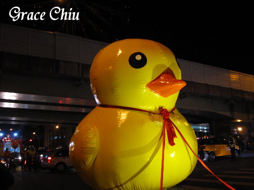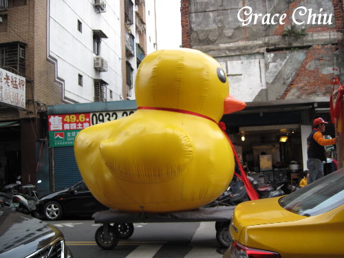 第一天的出發點在青山宮附近,我們用餐地點正好在青山宮附近的街口,用餐中看到陣頭隊伍正陸續前往集結中,然後看到這個!!“小鴨”~~~哈哈,今年小鴨話題真的很夯,小鴨也被抓來遶境了啦~~