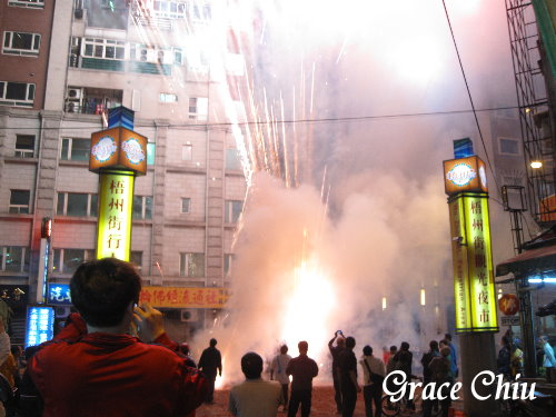 行經桂林路及梧州街交叉口發現工作人員正在排很大陣仗的炮火陣,代表隊伍壓軸的青山宮靈安尊王轎即將抵達囉~就先在這看一下下吧~煙火真的放的好熱烈呀!