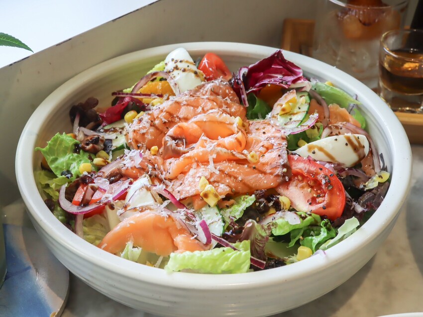 ▼份量真的超有誠意,一大碗端上桌視覺效果直接滿分!煙燻鮭魚鋪好鋪滿,每一口都吃得到滑嫩鹹香的口感。底層是新鮮生菜,清脆爽口不苦澀,還加了生洋蔥絲、起司粉增添層次。最加分的是自製的凱撒醬,酸甜中帶著果香,清爽不膩,整體搭配非常清新開胃,夏天吃完全無負擔!