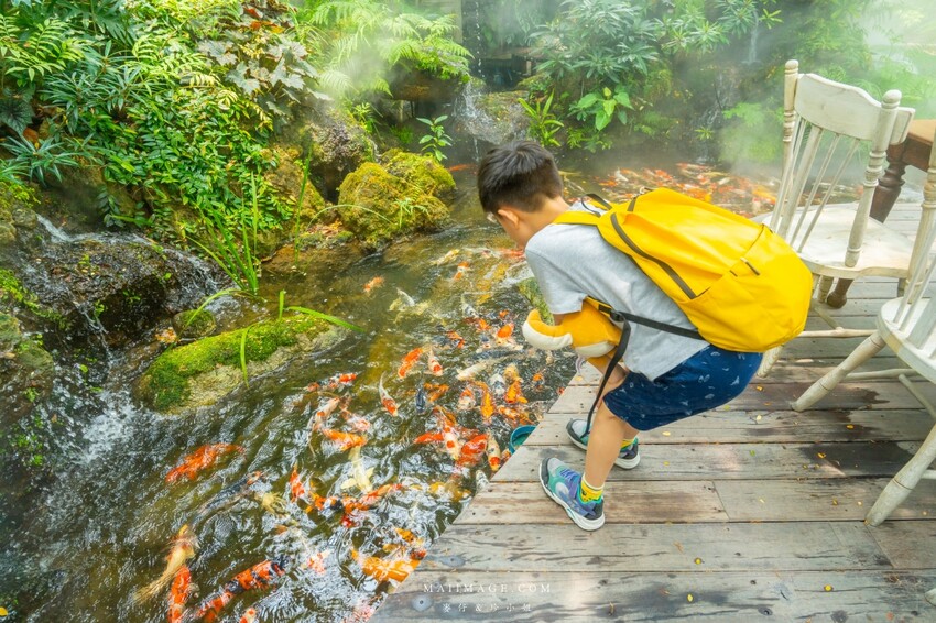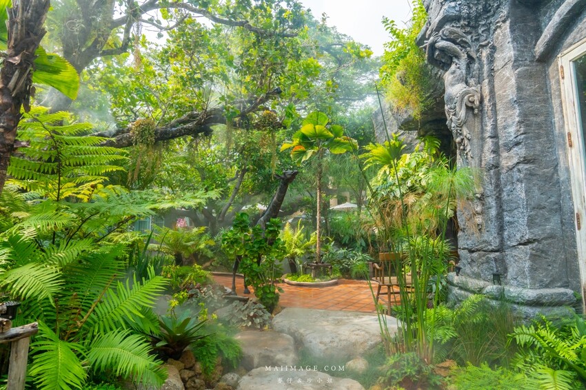 餐廳的用餐環境選擇非常多,您從一進門就能感受到完全不同的氛圍。我們這天就選在這顆已經有一百年歷史的海棠樹下用餐,大樹的樹蔭包覆著餐桌,即使坐在戶外也不會覺得炎熱,感覺相當舒服。我還看到了很吸睛的噴火龍和長頸鹿,搭配不時噴出的霧氣,感覺就像是在童話故事的叢林裡用餐一樣,非常夢幻。沿著餐廳往後走,還有造型特殊的石瓦屋,裡面是獨立長桌,如果人多的話,這裡是不錯的選擇。另外,造型特殊的涼亭區感覺更涼爽,不過因為在樹林中,蚊子會比較明顯,要記得帶防蚊用品喔。戶外區也能選擇坐在小橋流水旁,看著水裡的錦鯉,讓我感到相當愜意。