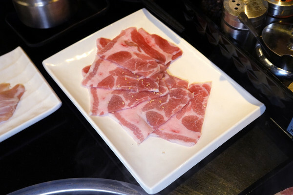一入座就有打卡禮,而且不是你打卡才有,是每位客人都送!從最底層往上疊好疊滿,一層比一層精彩,那個擺盤有灣月形設計,整個超適合拍照上傳!由下而上依序是牛五花、梅花豬、松阪豬、牛肋條,色澤油亮擺盤漂亮,看得出來都是有挑過的!