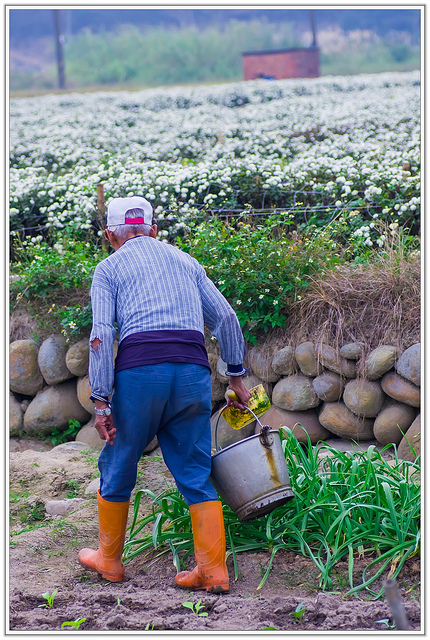 這位老爺爺,我在一旁偷偷看著他很久的時間,他就在花海的盡頭末端底下