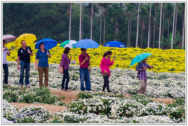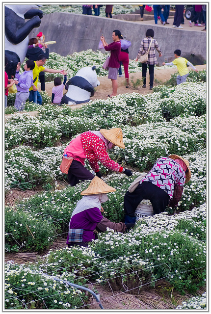 我們打著傘在悠遊花間愉快賞花時,同時也有人戴著斗笠低頭辛勤的工作!!