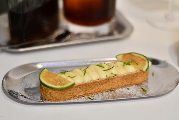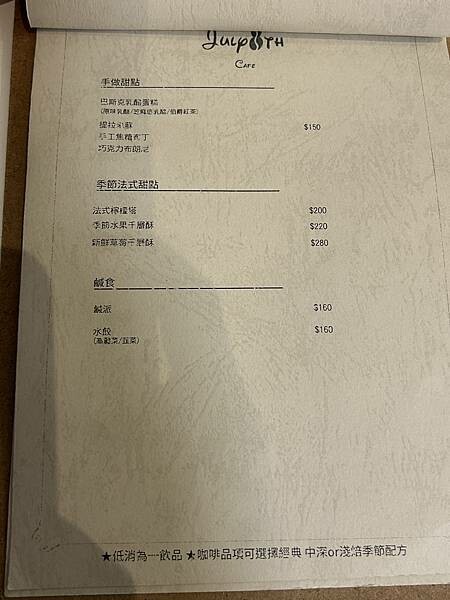 這次我們點了幾樣店裡的特色品項,像是冰滴咖啡、錫蘭紅茶、檸檬塔還有手工焦糖布丁。他們的冰滴咖啡真的很特別,用酒瓶裝著,還搭配了酒杯一起送上來,整個感覺就像在品嚐美酒一樣有氣氛。咖啡喝起來非常濃郁,加上裡面一大塊的冰塊,讓口感更順口好喝。雖然菜單上沒有鮮奶這個選項,但店家很貼心地為勛勛準備了一杯鮮奶,服務真的很好。錫蘭紅茶喝起來非常清新順口,完全不會有澀澀的感覺,味道很棒。手工焦糖布丁則是用高腳杯盛裝,看起來就很高貴,布丁的質地是屬於比較扎實的那種,但吃起來又很滑嫩,口感很不錯。檸檬塔的塔皮吃起來非常酥脆,裡面的檸檬內餡夠酸又很香,吃起來非常清爽過癮,讓人很喜歡。我們本來還想點季節水果千層酥,可惜已經賣完了,下次來這裡真的要更早一點才吃得到。